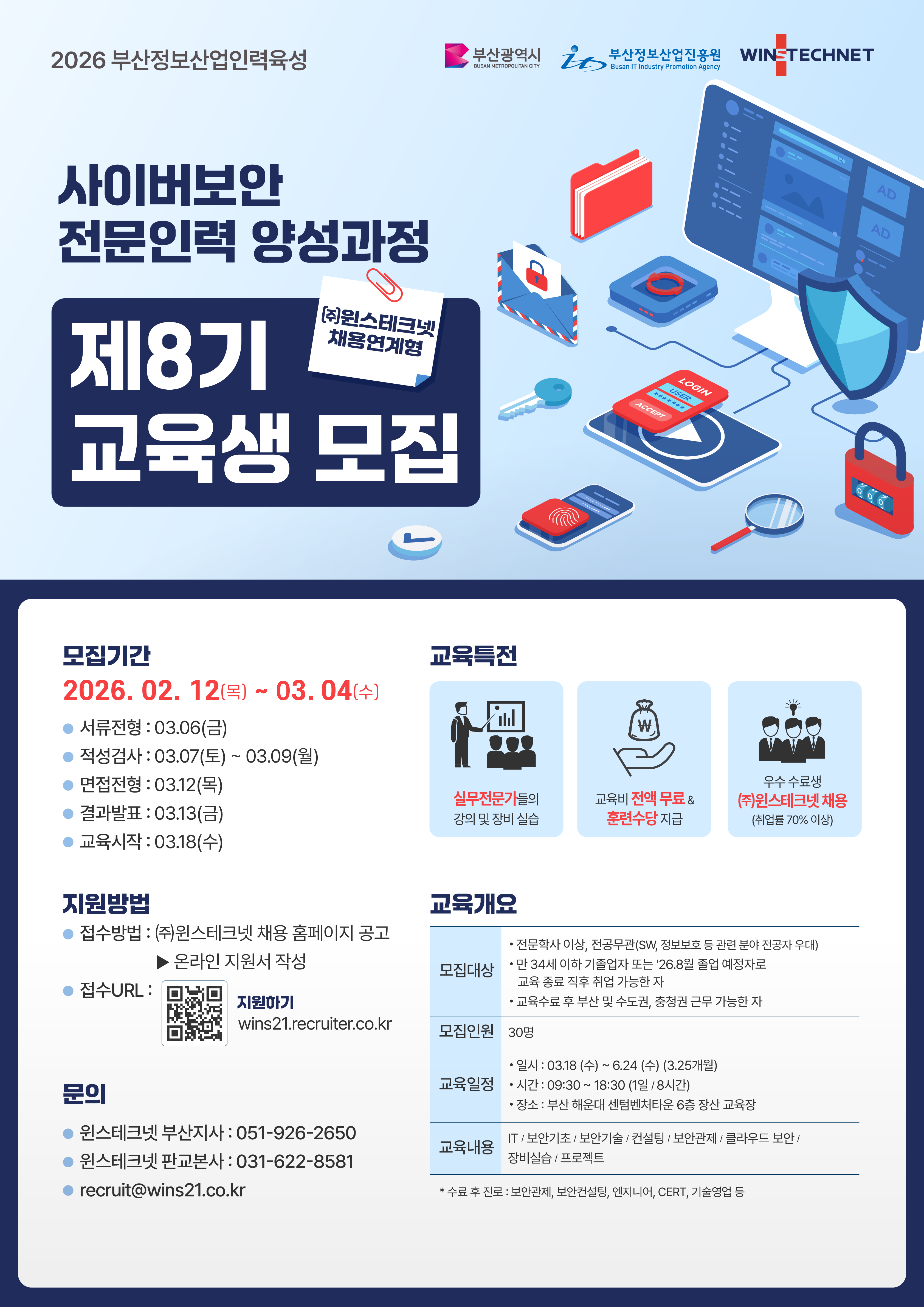 안녕하세요 :) 윈스테크넷 인사담당자입니다. 사이버보안 전문기업인 윈스테크넷에서 전문인력 양성 및 채용연계를 위해 교육생을 모집하고 있습니다. 대학 졸업 예정 또는 졸업생, 정보보안 산업에 관심 있는 학생 및 구직자들에게 많은 홍보 및 안내를 부탁드리고자 메일 드립니다. 선발된 교육생은 부산 센텀시티에 위치한 교육센터에서 약 3개월간 보안 기초부터 보안 장비 실습까지 교육을 받은 후 채용 연계가 진행되며, 지난 1~7기 교육생 중 70% 이상이 취업에 성공하였습니다. 이번 사이버보안 교육생 8기 모집 공고는 아래 내용을 참고해주시고, 적극적인 안내 부탁드립니다. 문의 있으신 경우 연락주십시오. (이메일 : recruit@wins21.co.kr / 전화 : 031-622-8607, 8581) 감사합니다. --------------------------------------------------------------------------------------------- [(주)윈스테크넷] 2026년 사이버보안 전문인력 양성 교육생 8기 모집(채용연계형) □ 채용 및 교육 기간 - 모집일정 : 2026.03.04(수)까지 - 서류결과 발표 : 2026.03.06(금) - 온라인 역량검사 : 2026.03.07(토) ~ 2026.03.09(월) - 면접전형 : 2026.03.12(목) (대면, 부산) - 결과발표 : 2026.03.13(금) - 교육일정 : 2026.03.18(수) ~ 2026.06.24(수) / 09시30분~18시30분 (1일 8시간)