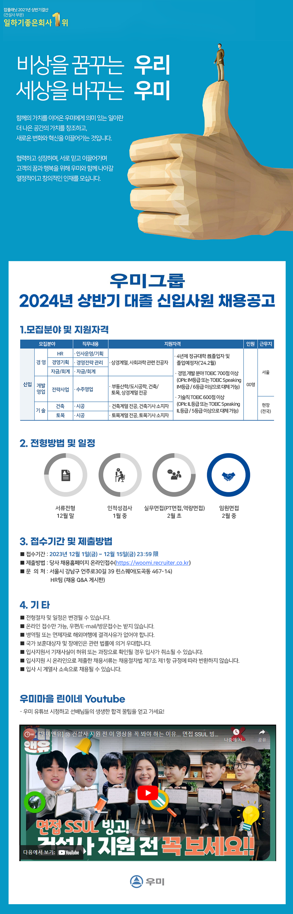 | 공고명 | 우미 2024년 상반기 대졸 신입사원 채용공고 |
